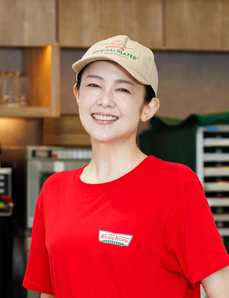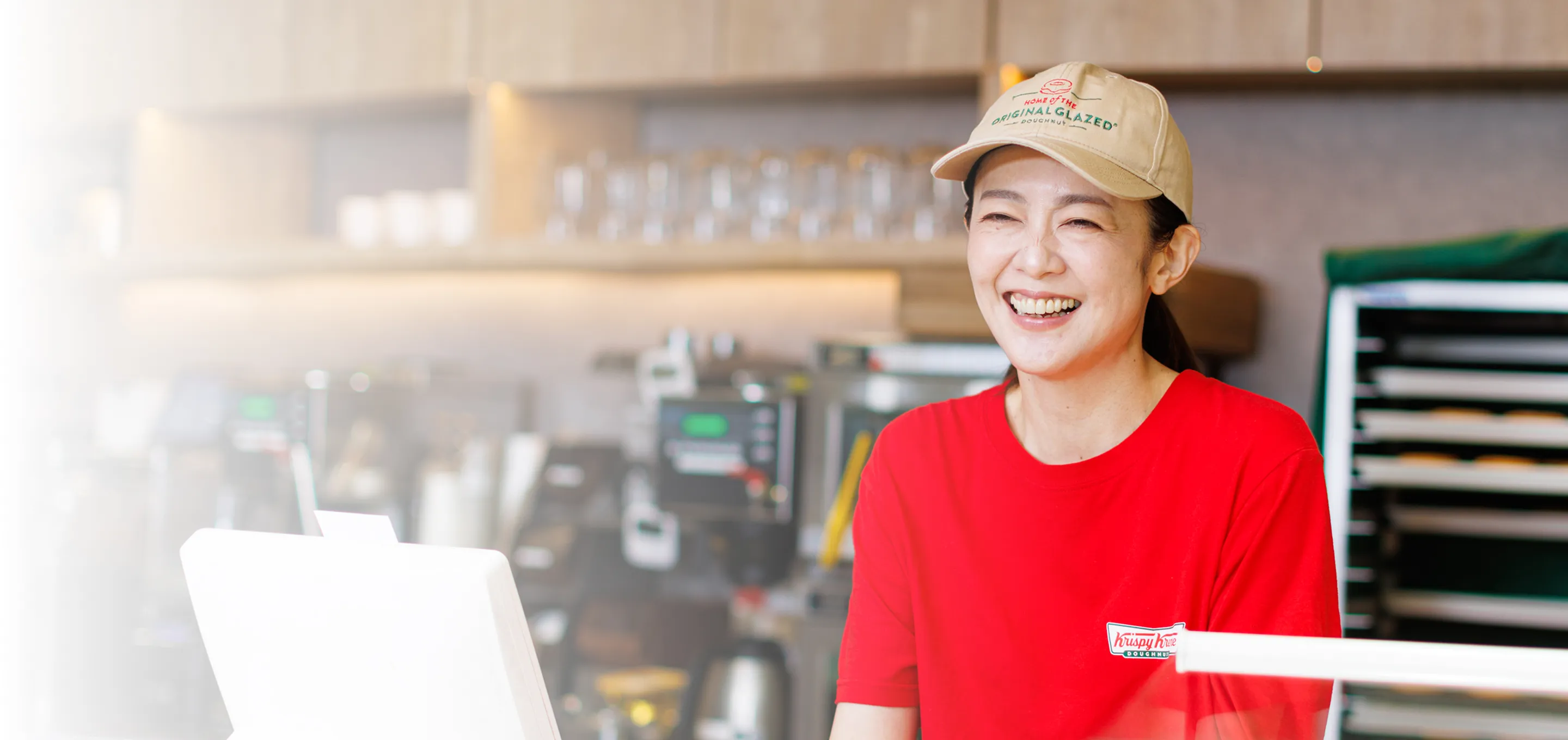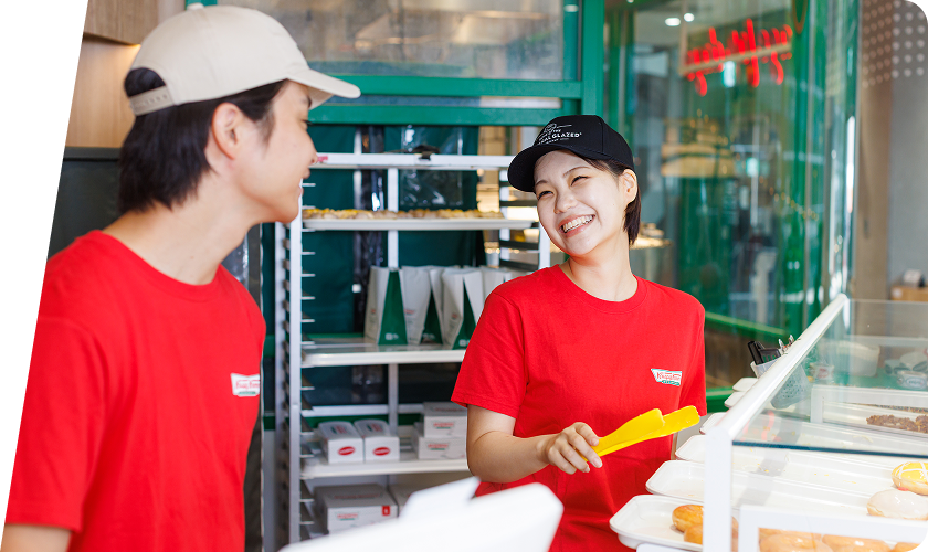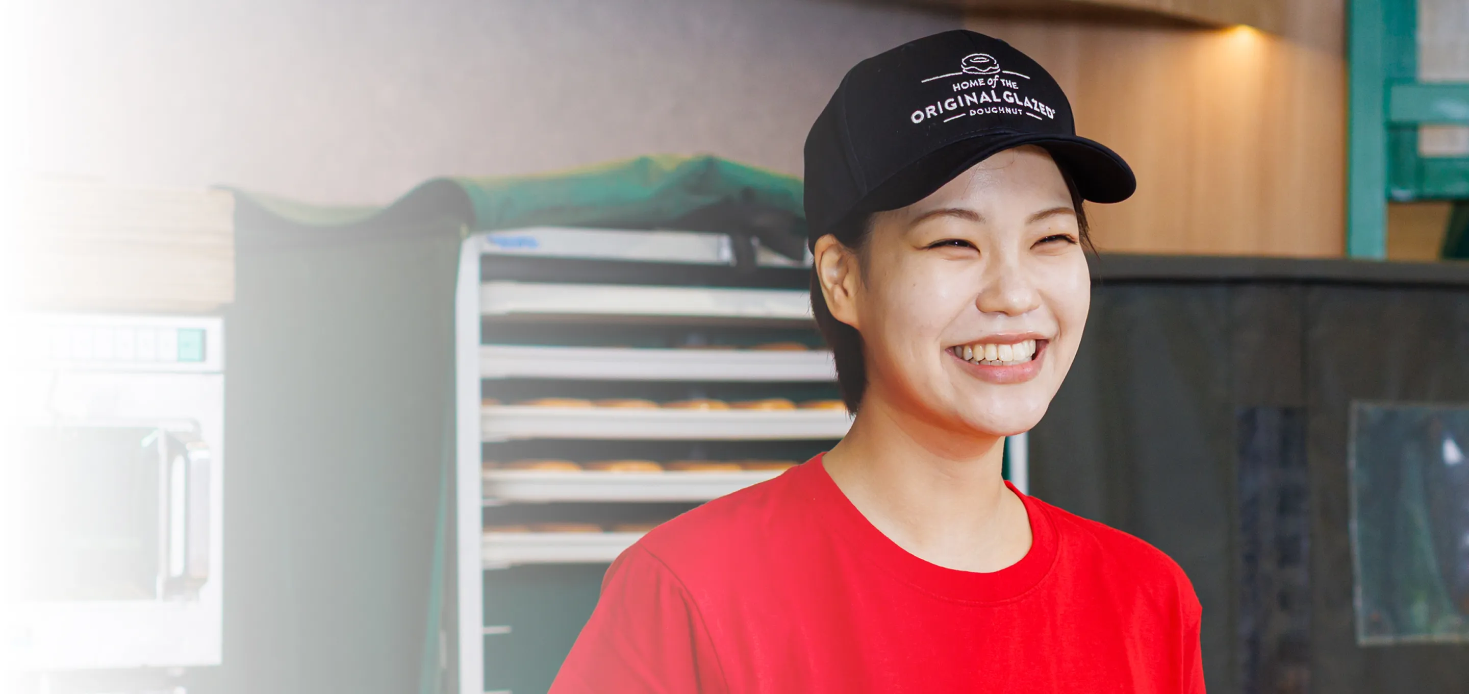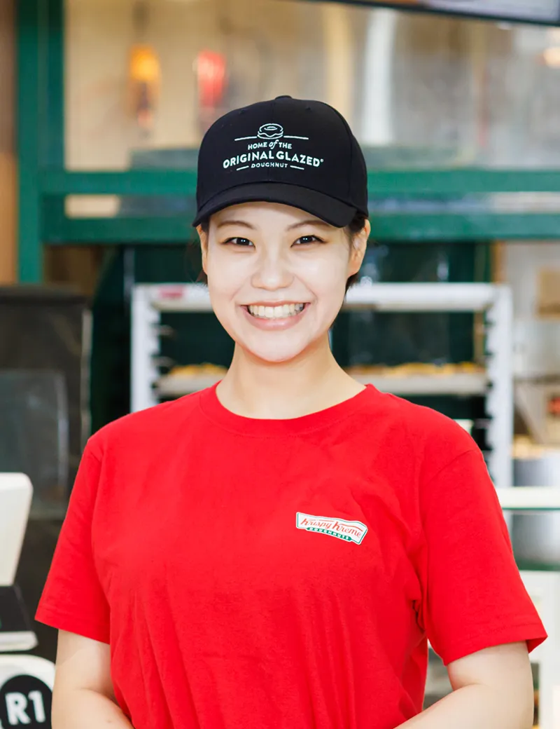 甘いものが好きなこと、そして接客の仕事は自分にとって初めてで、クリスピー・クリーム・ドーナツにはどこか特別な雰囲気があったことがきっかけで、ここで働いてみたいと思いました。実際に働いてみると、お客様とのやりとりが楽しくて、毎日新しい発見があります!