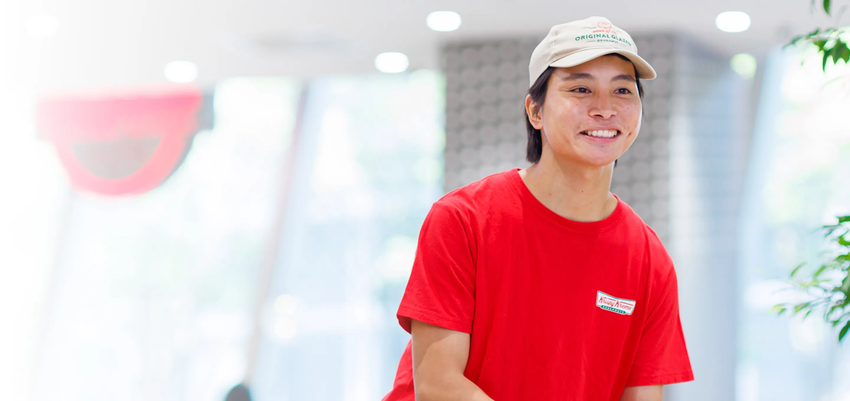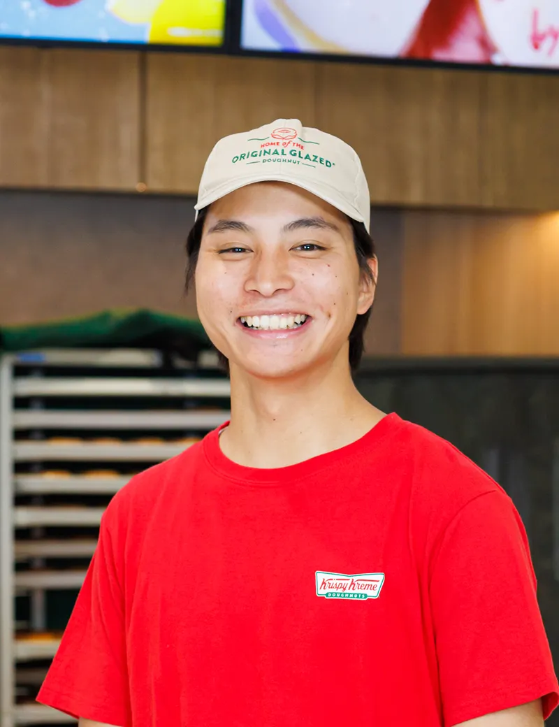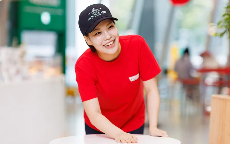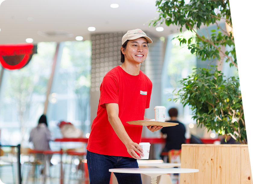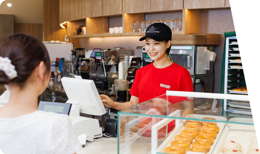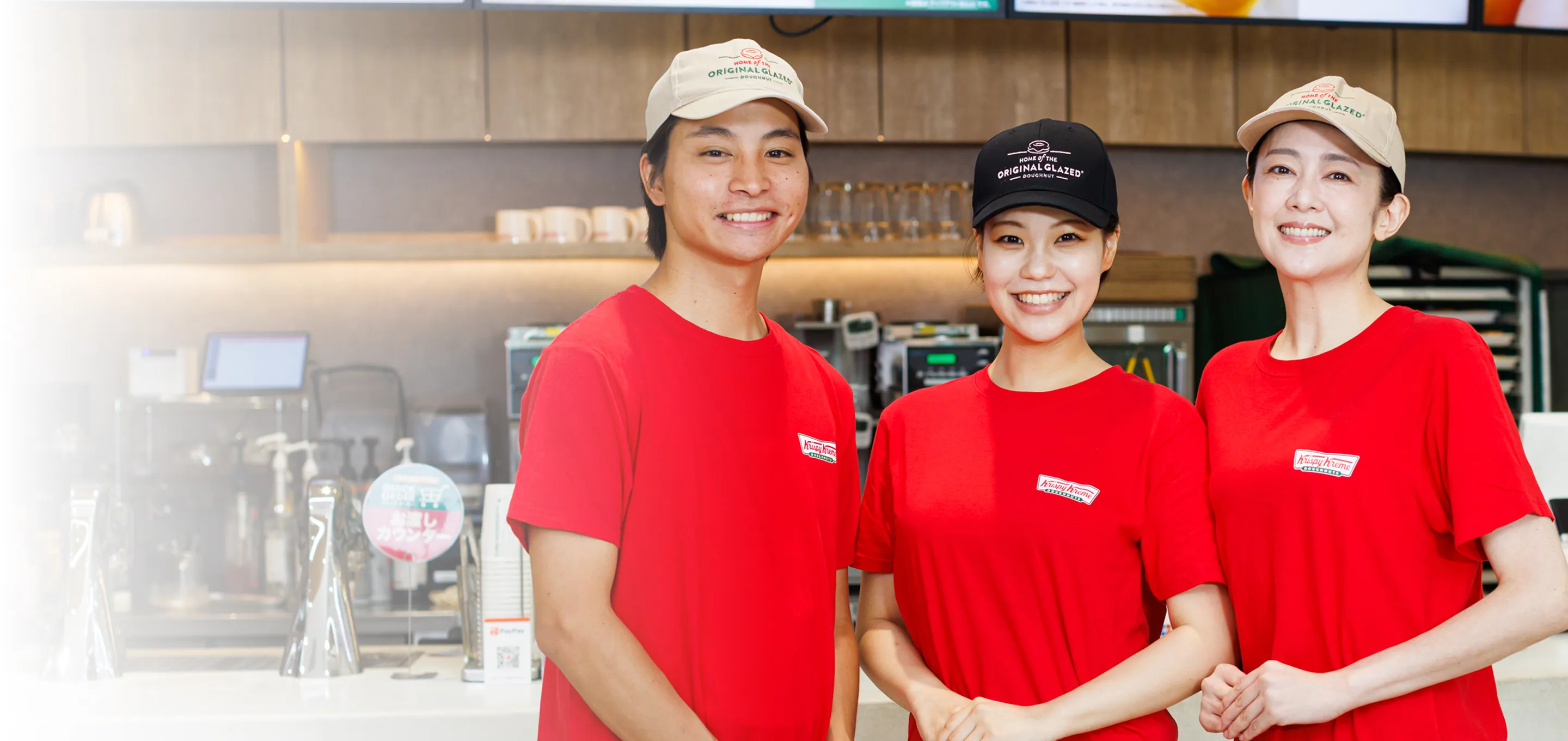 甘いものが好きなこと、そして接客の仕事は自分にとって初めてで、クリスピー・クリーム・ドーナツにはどこか特別な雰囲気があったことがきっかけで、ここで働いてみたいと思いました。実際に働いてみると、お客様とのやりとりが楽しくて、毎日新しい発見があります!