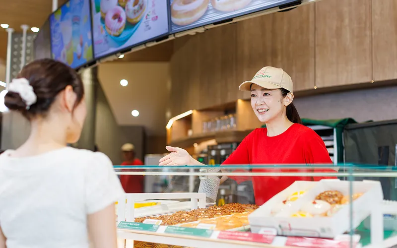 働くうちに、「どうしたらお客様がドーナツを買いたくなるかな?」って自然と考えるようになりました。見せ方や声かけのタイミングなど、ちょっとした工夫で反応が変わるのが面白くて、やりがいを感じています!