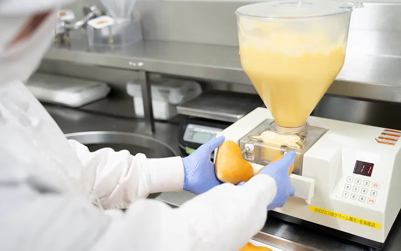 ドーナツの中に、決められたグラム数のクリームを正確に詰める作業です。商品ごとの仕様に沿って、丁寧かつキレイに仕上げることが求められます。