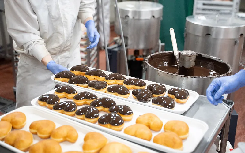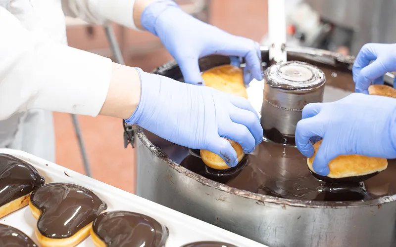 完成したドーナツにクリームを詰めたり、チョコレートをつけたりするなど、ドーナツ作りの最終工程を行います。