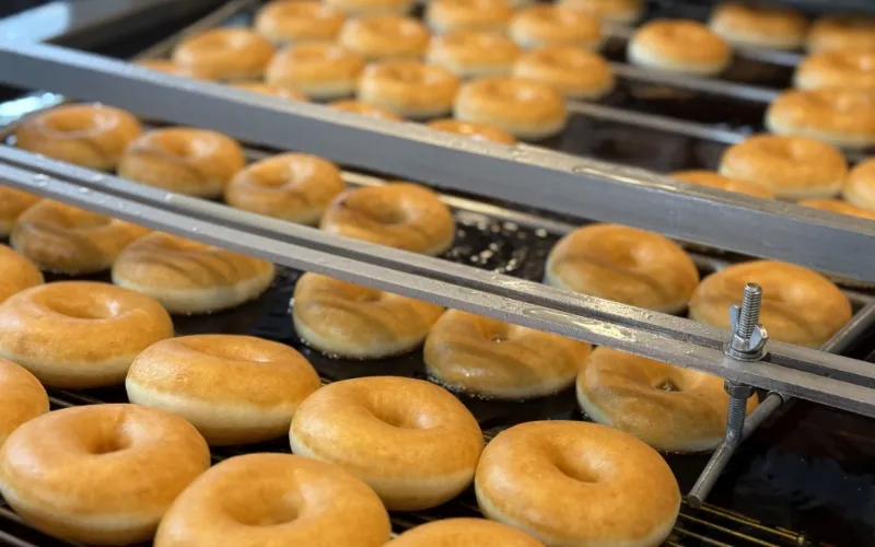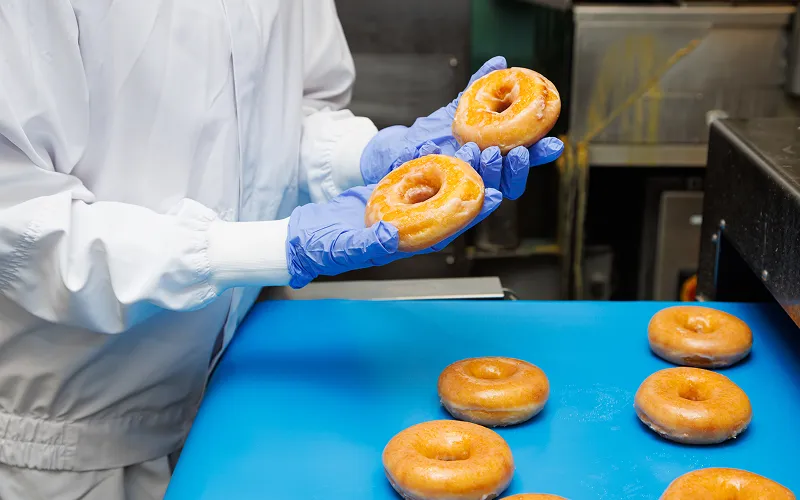 揚げ上がったドーナツを種類ごとに選別し、次の工程へと振り分けます。商品ごとの特徴を見極めながら、スピーディーかつ丁寧に対応します。
